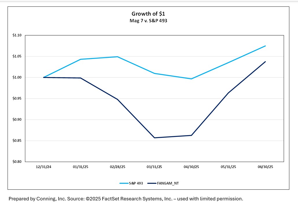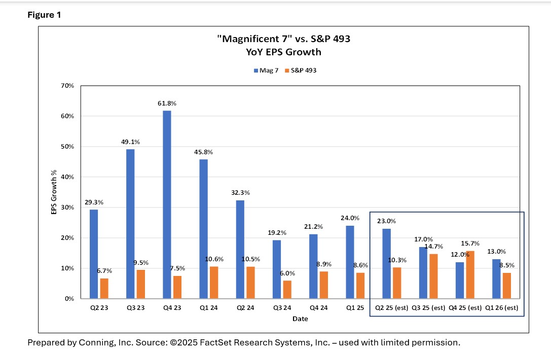 We can also see the drop in earnings expectations for the Mag 7 in conjunction with significant increases in expected earnings for the rest of the S&P 500 (including estimates of EPS growth for the next four quarters). While the Mag 7 are still expected to grow earnings at a higher rate than the S&P 493, the gap in earnings growth between the two groups is expected to shrink, implying that the P/E multiples of the groups should converge. Perhaps a correction in the Mag 7stocks could happen along with a broadening market, where the rest of the market goes down less than Mag 7 while providing competitive returns when the market turns back up. Through Q2 2025, the S&P 493 has provided solid returns with lower volatility than the Mag 7 (as seen in Figure 2), and this is likely to persist if earnings grow as expected.