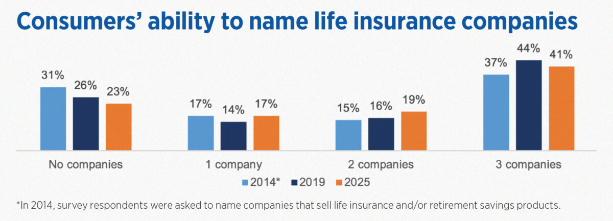 While there are more than 700 life insurance companies in the U.S., survey respondents named 257 unique entities (including some insurance agencies, associations and nonspecific entities like “Mutual”). The 10 most frequently named companies in 2025 accounted for 56% of all consumer mentions. As people often don’t differentiate between different types of insurance companies, the list of the best known “life insurance” companies includes personal line insurers again this year.