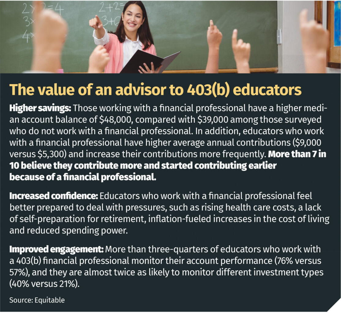 Research also shows that educators in 403(b) plans who work with a financial professional have better retirement outcomes. According to an Equitable survey of 1,001 K-12 educators, those who used a 403(b) financial professional had an average annual contribution of $9,000, as opposed to an annual contribution of $5,300 for employees who elected to not work with a financial professional. In addition, the survey found K-12 educators who work with a financial professional were likely to have a higher median retirement account balance of $48,000 compared to $39,000 for those who do not work with one.